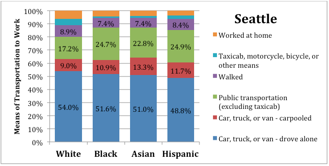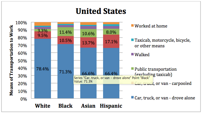 The United States aggregate sets the baseline as an average. It’s not surprising that over a third of people drive to work in this country. Considering that national policy has done nothing but subsidize unsustainable growth based upon the proliferation of the automobile, U.S. citizens probably aren’t driving as much as they could be. What is interesting is that Hispanics and Asians don’t drive as much as whites and blacks. I assume that, per capita, car ownership is comparable.
