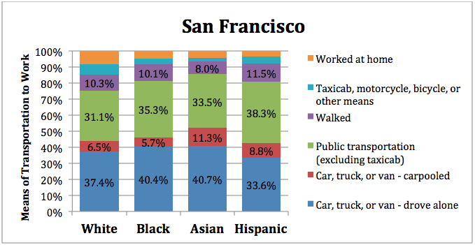 Significant portions of San Francisco residents utilize mass transit to get to work in the morning. I also assume these numbers include the Google buses that are so vehemently hated for chauffeuring millionaires to their jobs by using public, Muni bus stops as pick-up locations. Regardless of the politics of mass transit, San Fran has been the only city whose white population drives less than its black population. The hypothesis that the suburbs are becoming the ghettos of the future may perhaps be demonstrated in this simple little statistic.