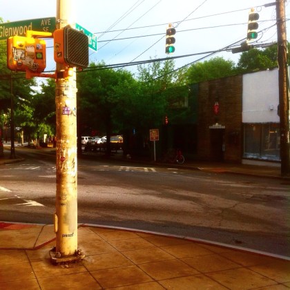 A transparent somnambulist, through the East Atlanta Village. Down rows of pretty houses, up the street to the main square where Flat Shoals and Glenwood meet.